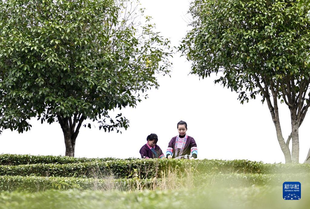 2月9日,在光輝村馬灣茶園,茶農在采摘春茶。