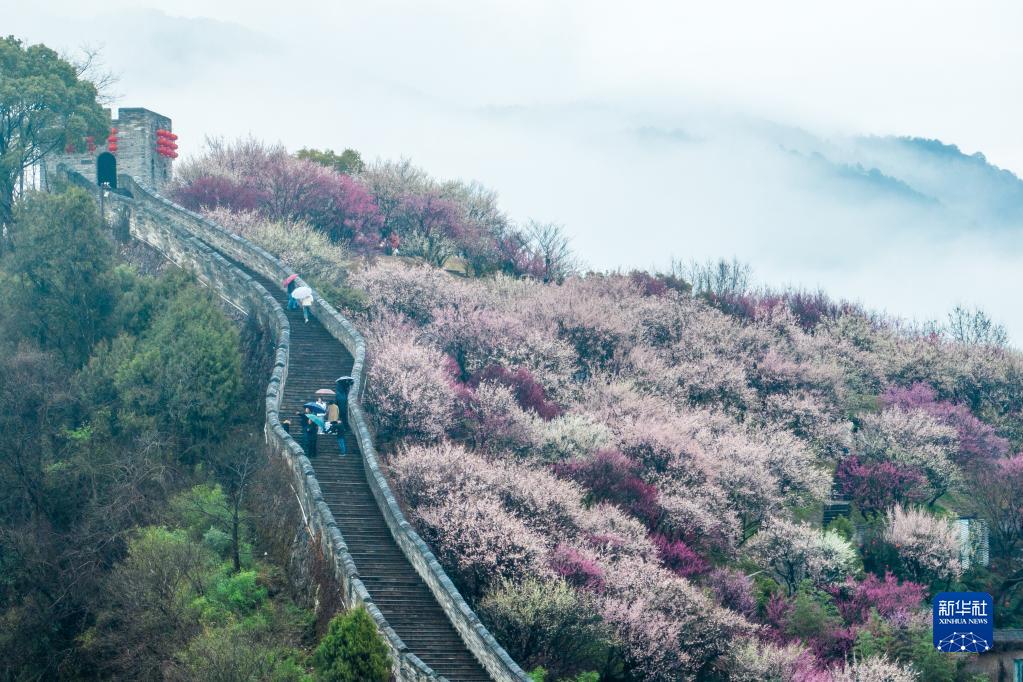 2月9日,市民在浙江省臨海市游古城墻、賞梅花(無人機照片)。