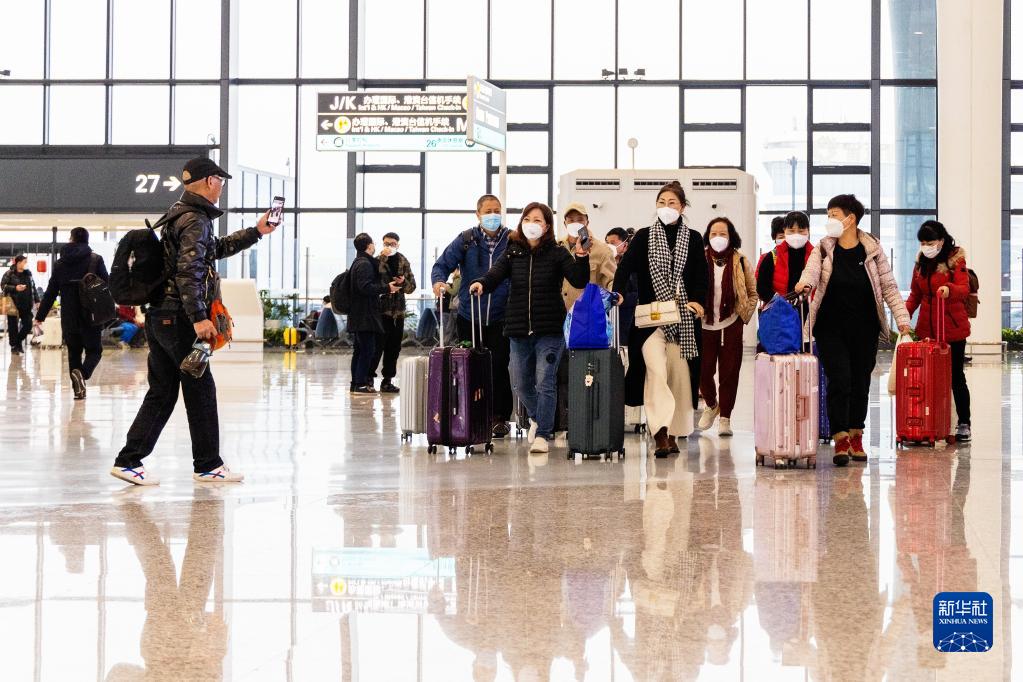 2月8日,前往印尼巴厘島的旅行團旅客在杭州蕭山國際機場T4航站樓候機。