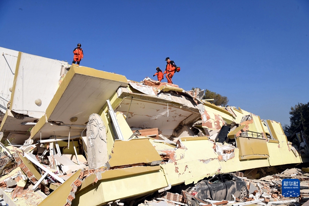 2月9日,中國救援隊隊員在土耳其哈塔伊省安塔基亞市的受損建筑上開展救援工作。