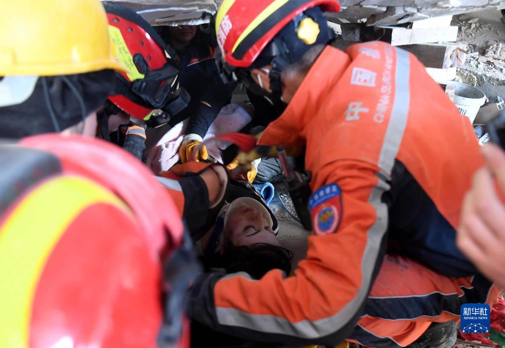 在土耳其南部地震重災區哈塔伊省安塔基亞市,中國救援隊同土耳其救援隊合作,于當地時間9日下午救出一名被埋在樓房廢墟下的女性幸存者。新華社記者 沙達提 攝