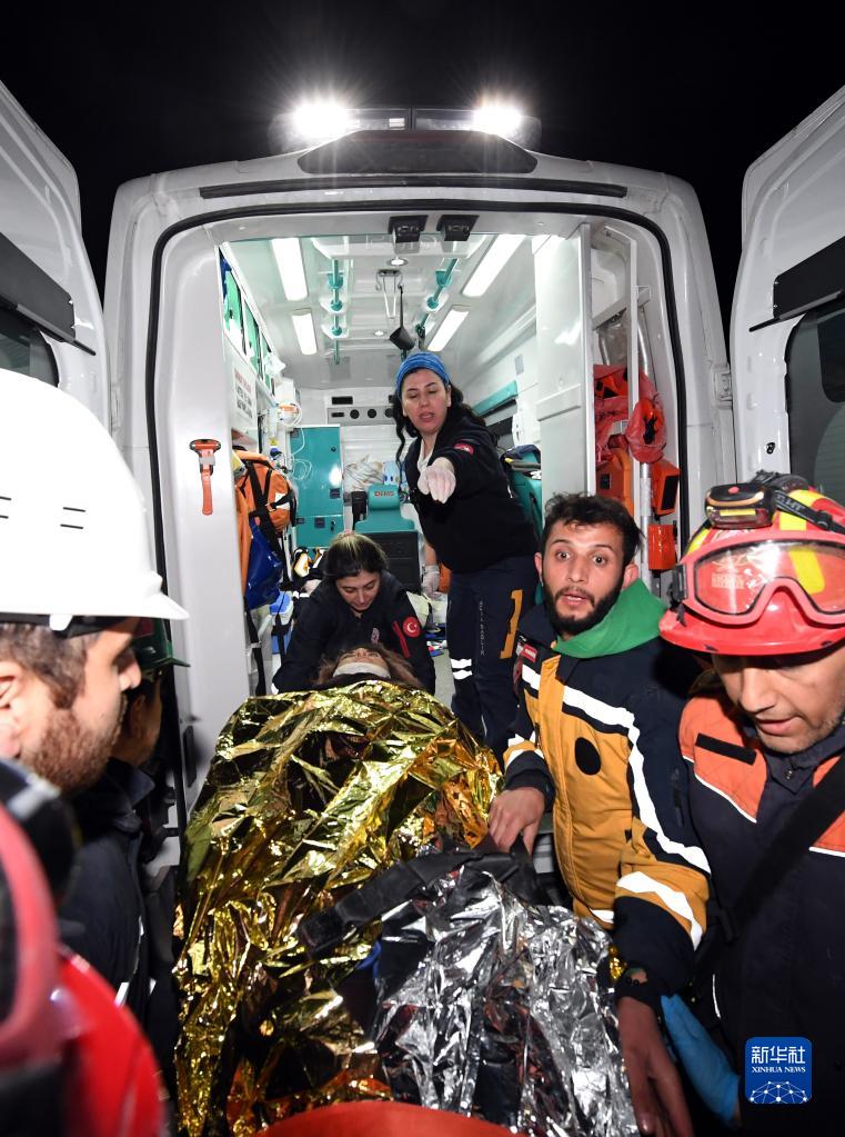 2月9日晚,在土耳其哈塔伊省安塔基亞市,中國救援隊與土耳其救援隊合力營救出的幸存者被送上救護車。