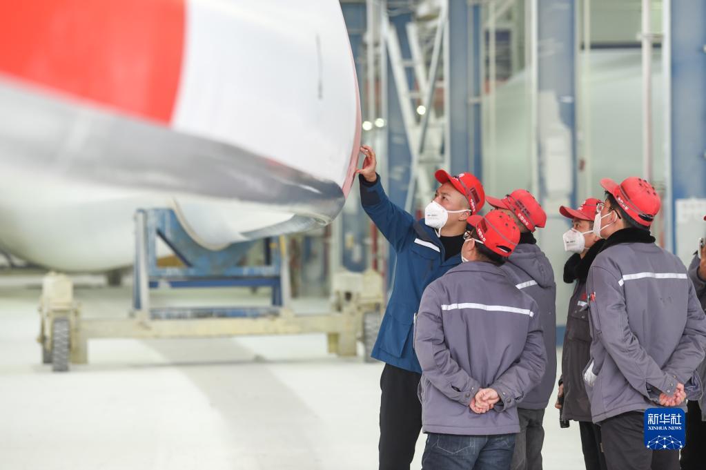 2月9日,工人在株洲時代新材料科技股份有限公司蒙西分公司風力發電葉片生產車間內檢查風力發電葉片。