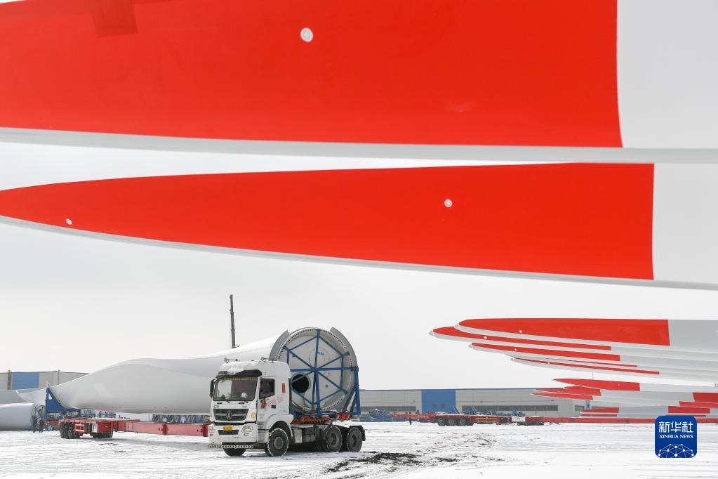 2月9日,車輛在株洲時代新材料科技股份有限公司蒙西分公司內運輸風力發電葉片。