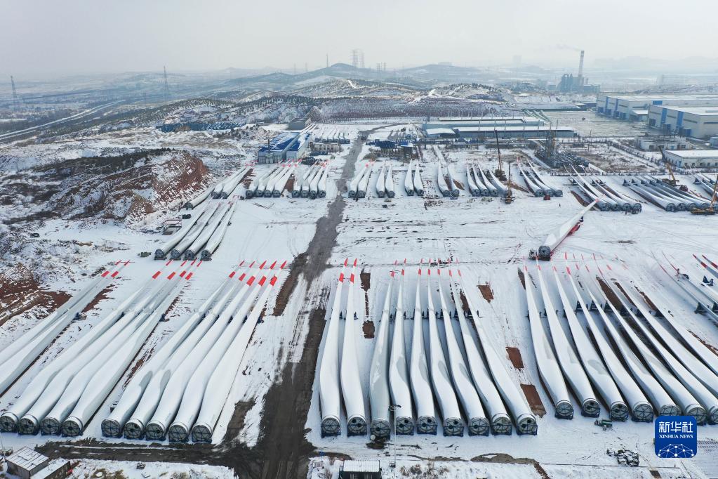 2月9日拍攝的株洲時代新材料科技股份有限公司蒙西分公司內的風力發電葉片(無人機照片)。