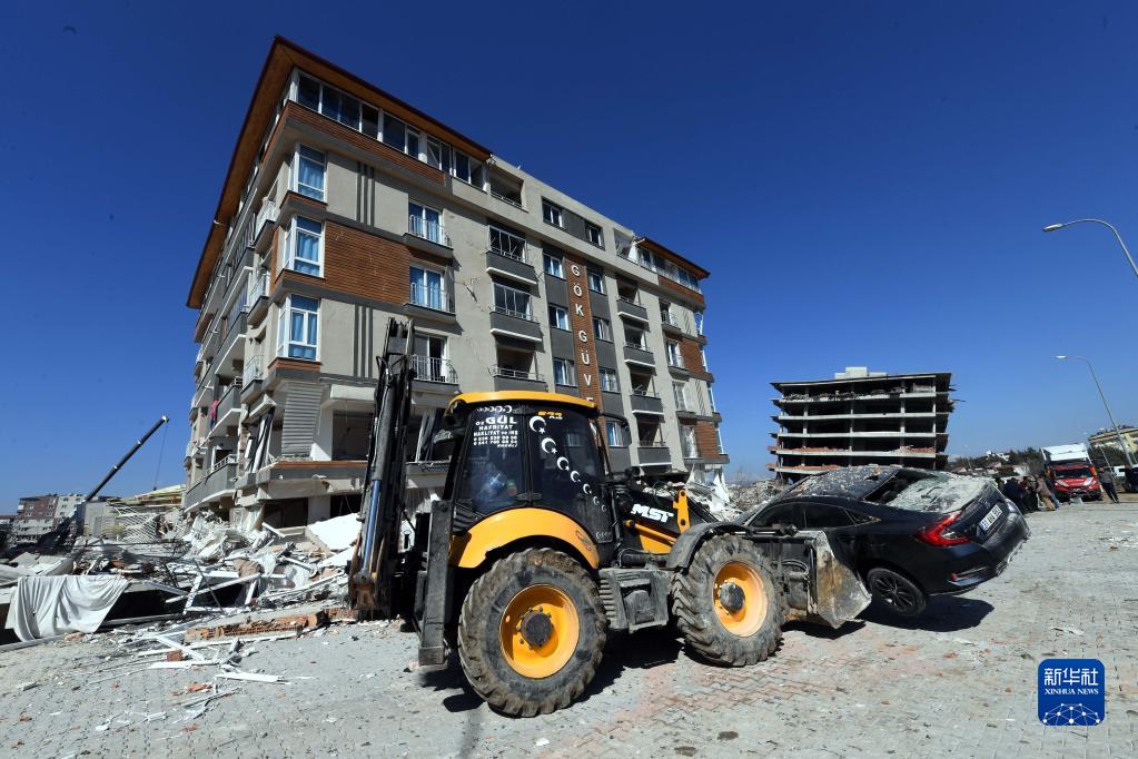 2月9日,大型機械在土耳其哈塔伊省安塔基亞市一處受損的建筑物作業。