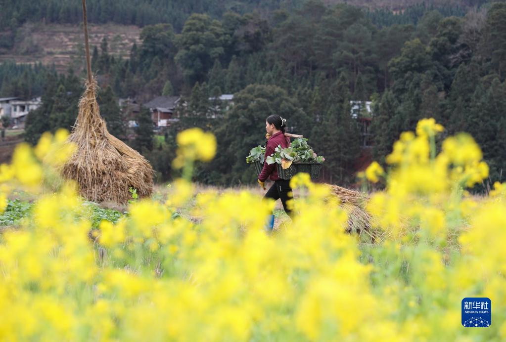 2月9日,村民在貴州省黔東南苗族侗族自治州從江縣剛邊壯族鄉三聯村田間挑運蔬菜。