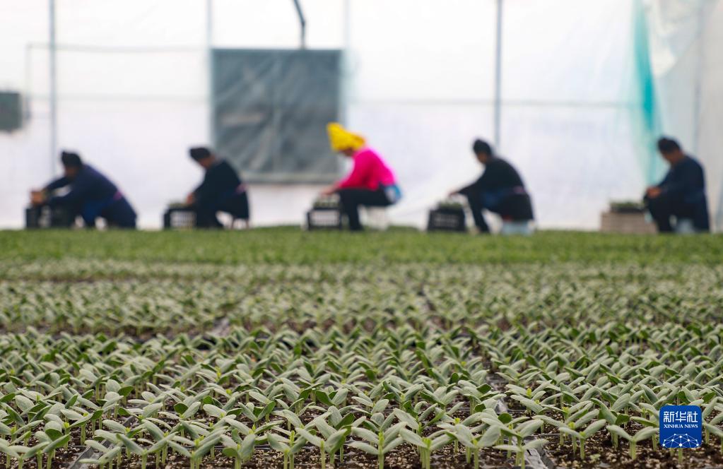 2月9日,貴州省黔東南苗族侗族自治州丹寨縣興仁鎮城江村,瓜農在西瓜育苗基地嫁接西瓜苗。
