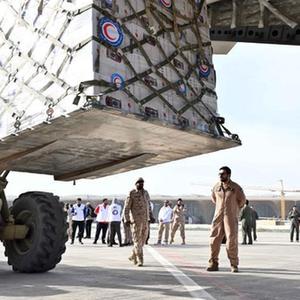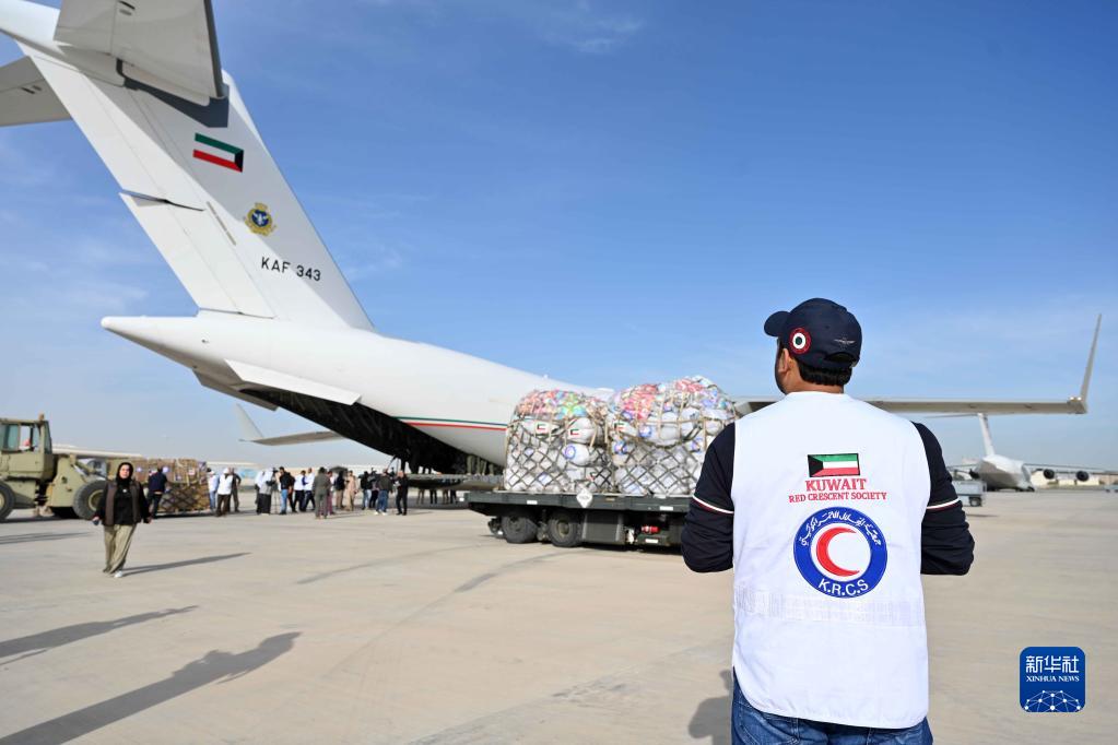 2月9日,工作人員在科威特費爾瓦尼耶省的科威特國際機場裝載人道主義援助物資。