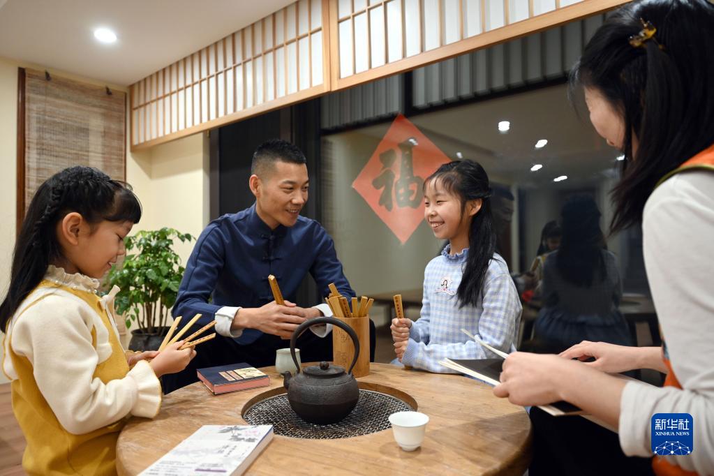 馬保利在家中與孩子吟詩玩“飛花令”(2月3日攝)。