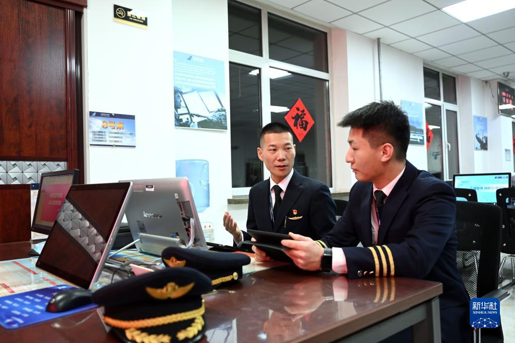 馬保利在飛機起飛前與同事討論工作安排(2月4日攝)。