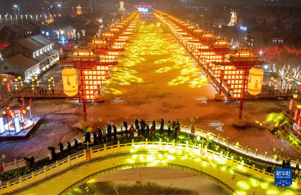2月9日,游客在唐山市豐南區河頭老街踏雪觀光(無人機照片)。
