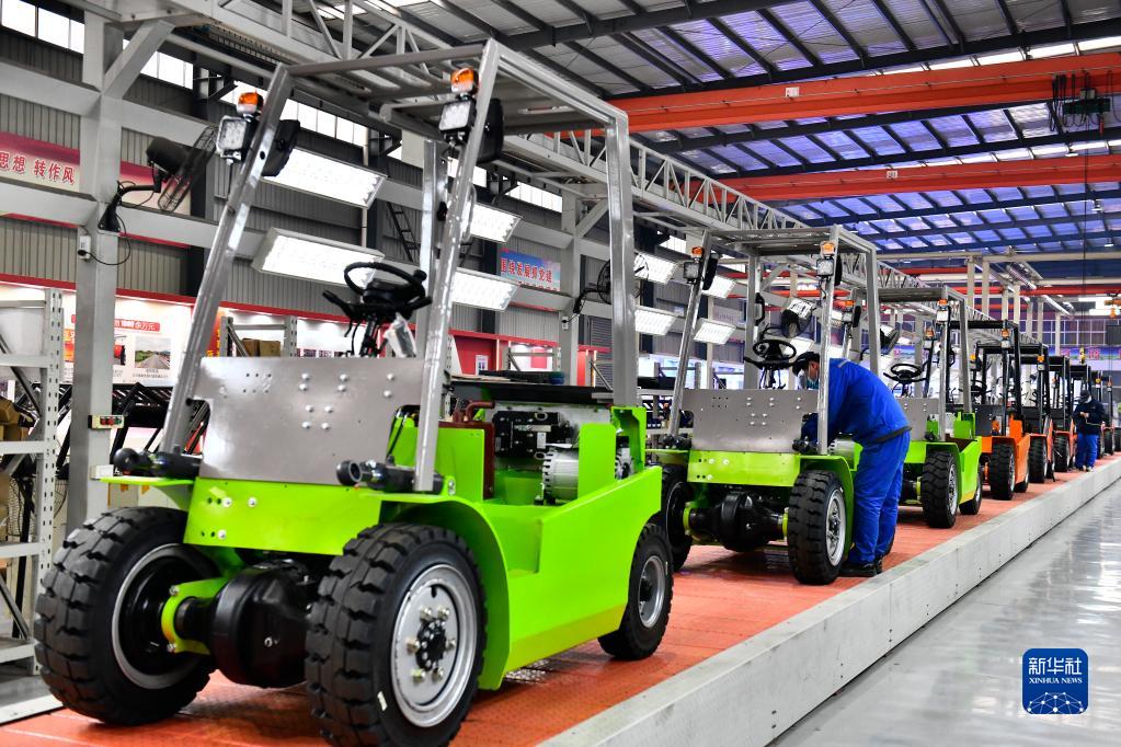 2月10日,一企業工作人員在電動叉車作業生產線忙碌。