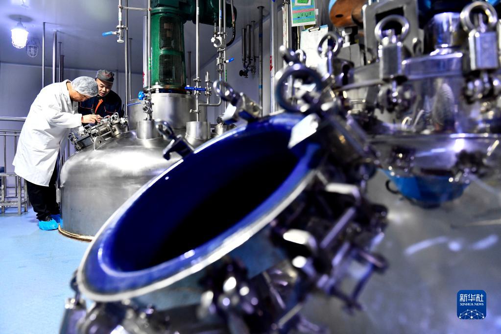 2月10日,泰山產業領軍人才劉建洋(左)在一公司車間查看肝素鈉提取情況。