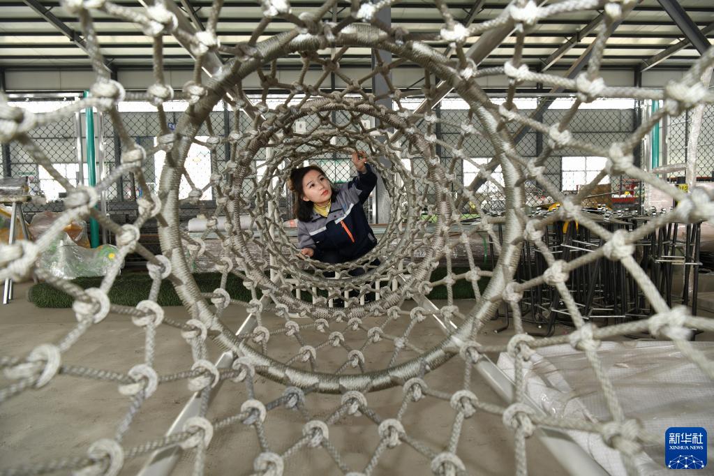2月9日,在位于海興縣的滄州市益奧特體育裝備有限公司,工人在檢測一款戶外運動產品質量。