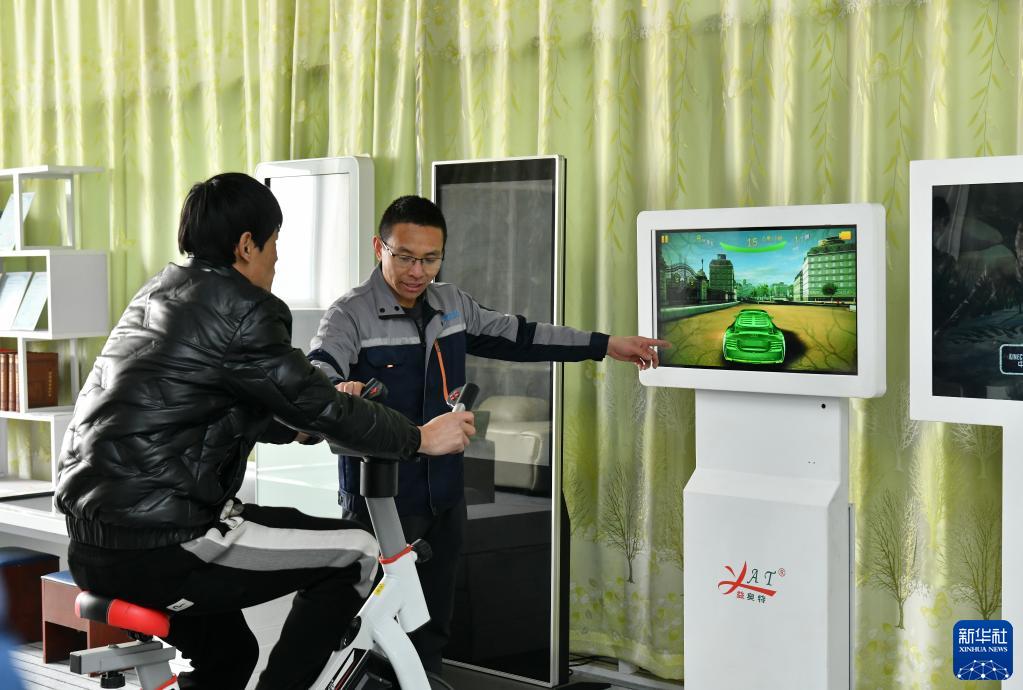 2月9日,在位于海興縣的滄州市益奧特體育裝備有限公司,工作人員在向客戶推薦一款智能健身產品。