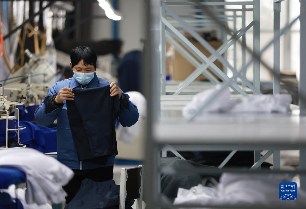 工人在河北內丘一家制衣企業生產車間工作(2月9日攝)。