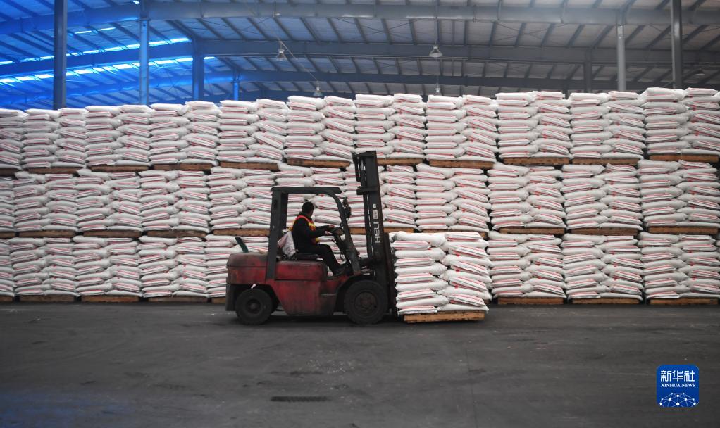 2月8日,在位于河南省商丘市寧陵縣的嘉施利(寧陵)化肥有限公司,工作人員在裝運化肥。