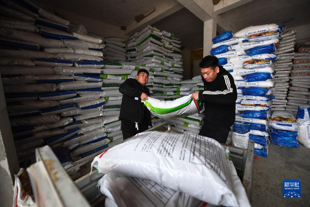 2月8日,在河南省商丘市寧陵縣柳河鎮桃園關村一家農資超市,村民將購買的化肥運到三輪車上。
