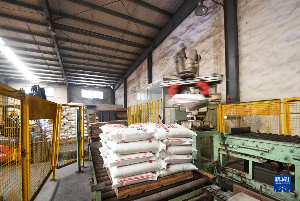 2月8日,在位于河南省商丘市寧陵縣的嘉施利(寧陵)化肥有限公司,機械臂在化肥生產線上作業。