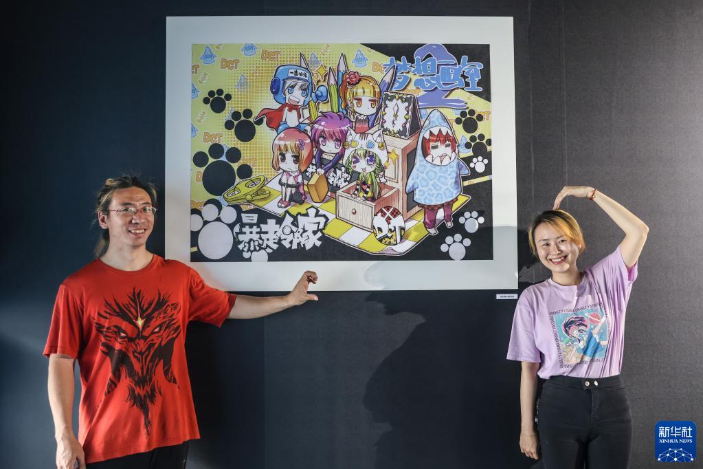 2月9日,在??谑旋垬蜴偛龑W村的“燚界·漫創社”創業孵化基地的展廳內,漫畫家“極樂鳥”(左)和妻子“翔”在自己的動漫作品前合影。
