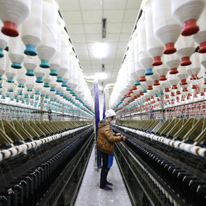 2月10日,工人在唐山市豐南區一家紡織企業的生產車間工作。