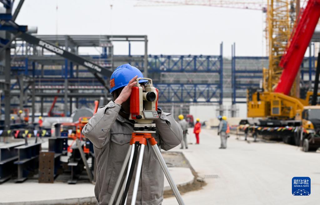 2月9日,建設者在天津南港乙烯項目建設施工現場進行測量。