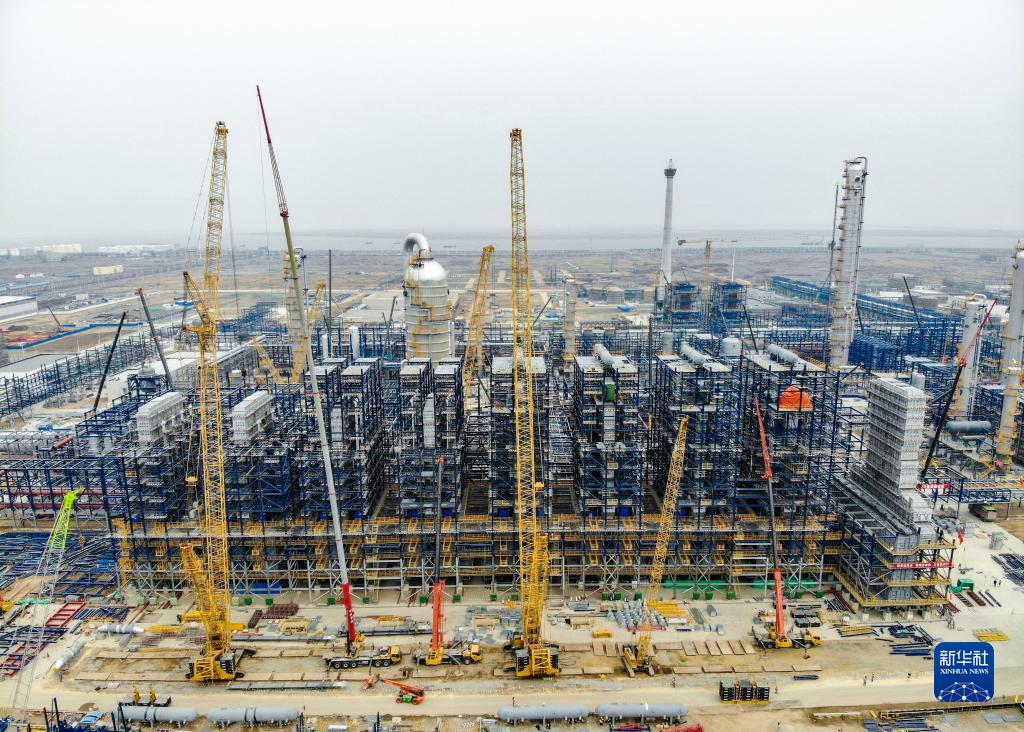 這是2月9日拍攝的天津南港乙烯項目建設施工現場(無人機照片)。