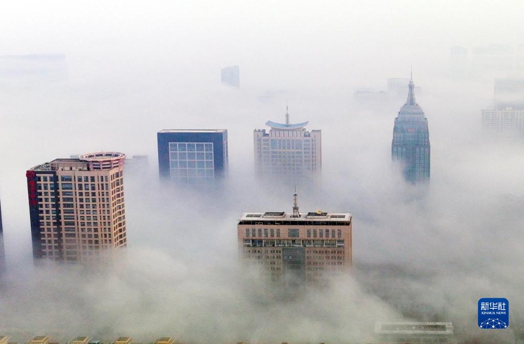 當日,寧夏銀川市出現平流霧景觀,城市建筑若隱若現,如夢如幻。