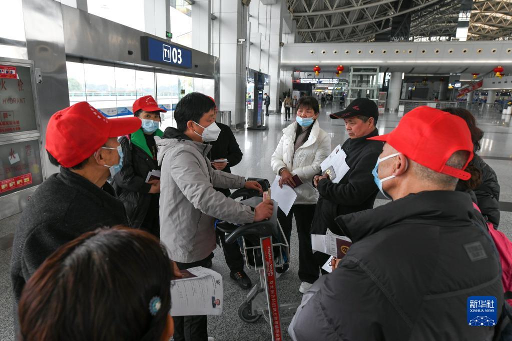 2月10日,在成都雙流國際機場T1航站樓,旅行社領隊向赴泰旅行團講解注意事項。