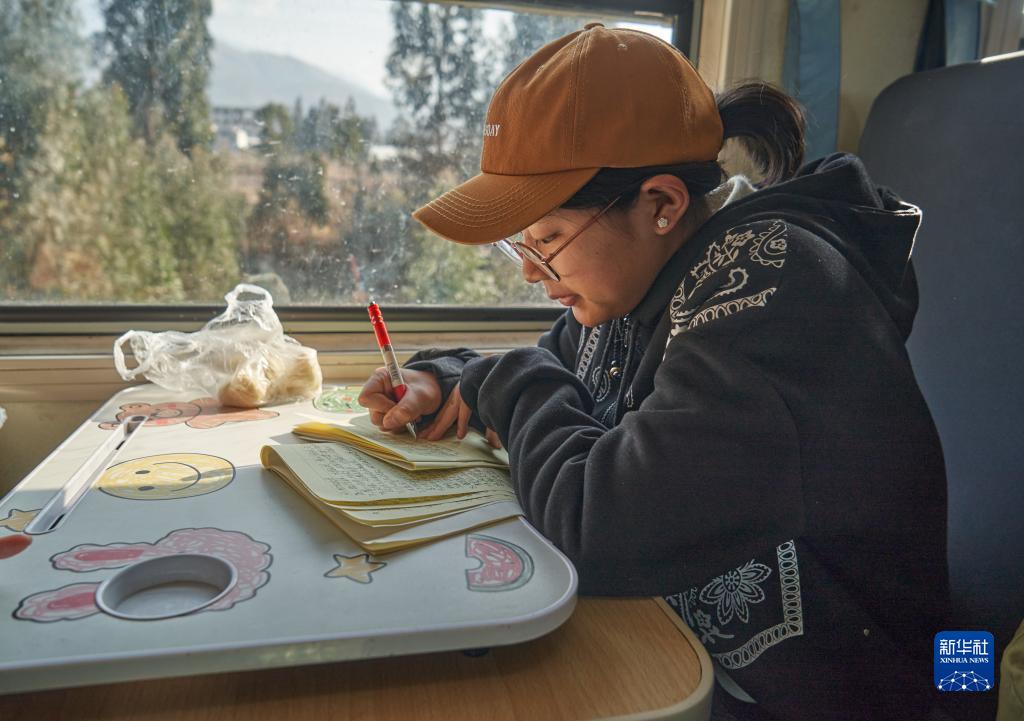 2月9日,學生在5633次列車上寫作業。