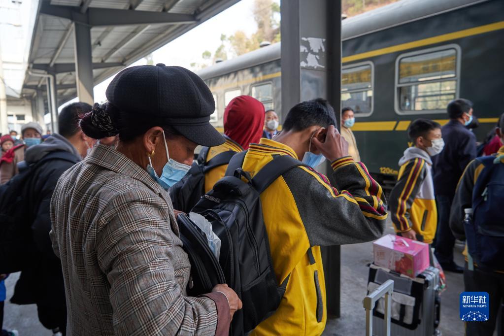 2月9日,在四川涼山州喜德縣火車站,家長幫即將上火車的學生整理背包。
