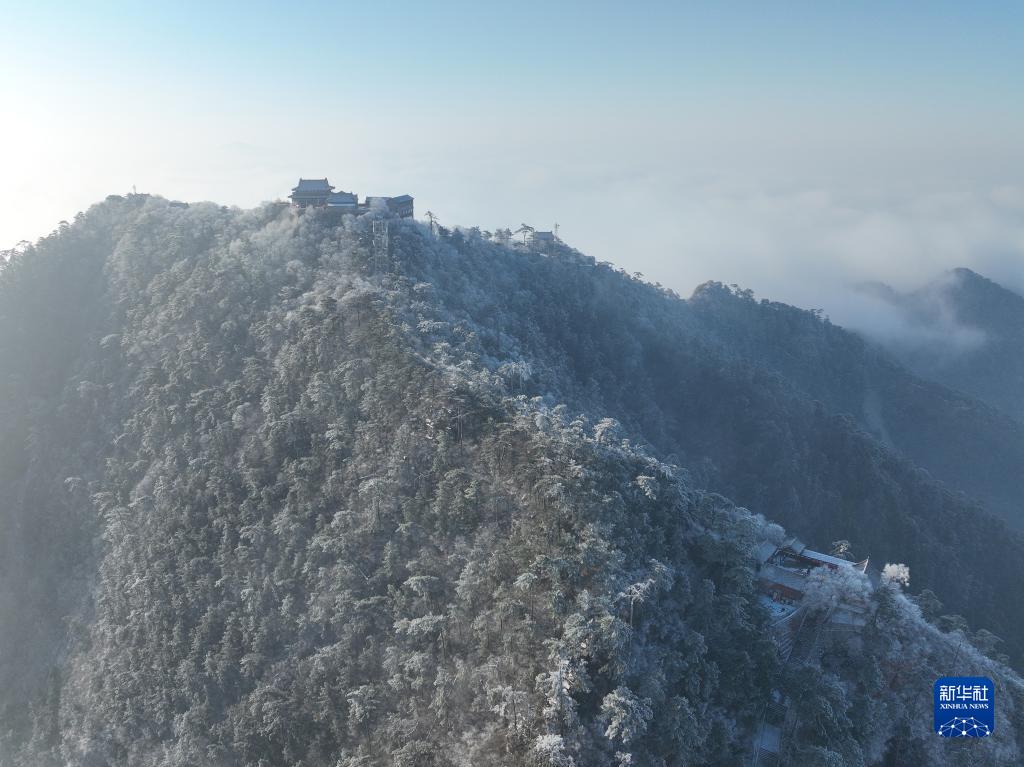 當日,雪后的河北唐山市遷西縣出現云海霧凇景觀,山峰、樹木、古建筑在云霧中時隱時現,美如畫卷。