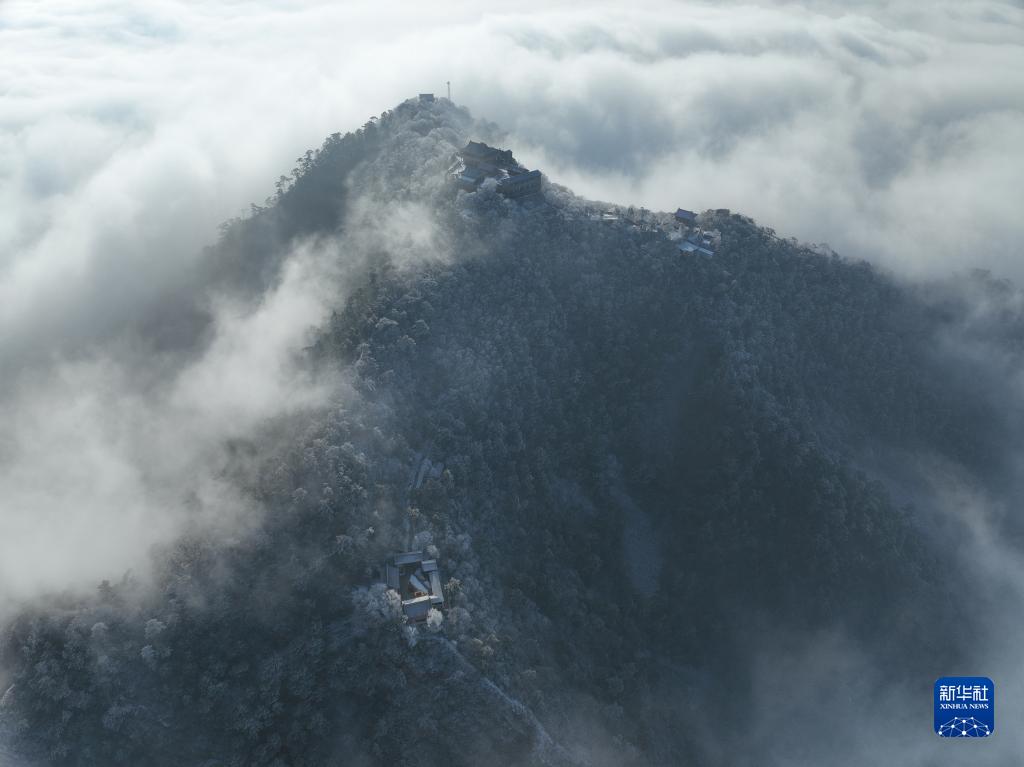當日,雪后的河北唐山市遷西縣出現云海霧凇景觀,山峰、樹木、古建筑在云霧中時隱時現,美如畫卷。