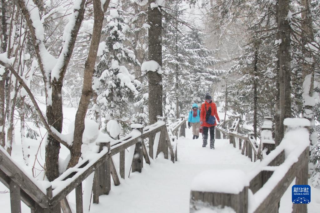 近日,黑龍江牡丹江市雙峰林場迎來降雪,紛紛揚揚的雪花給游客帶來驚喜。