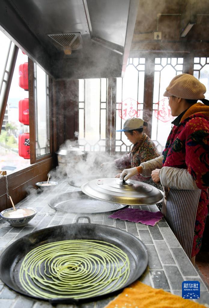 2月10日,宣恩縣興隆老街上的居民在制作土家傳統美食“綠豆皮”。
