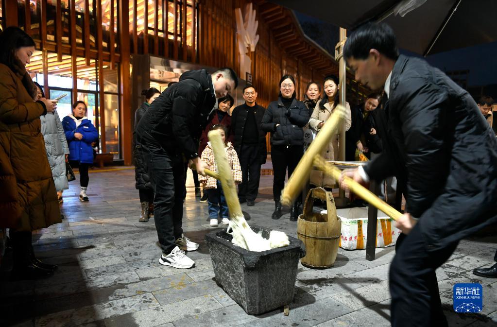 2月9日,游客在宣恩縣興隆老街體驗打糍粑。
