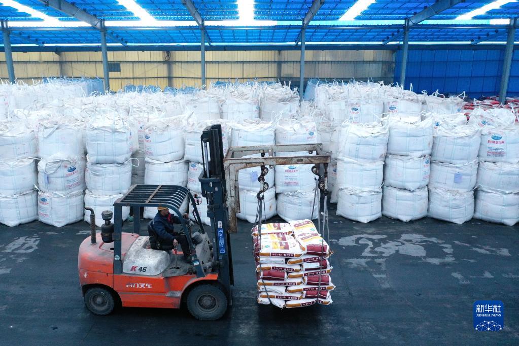 2月10日,河南省焦作市溫縣昊邦肥業職工在運送化肥(無人機照片)。