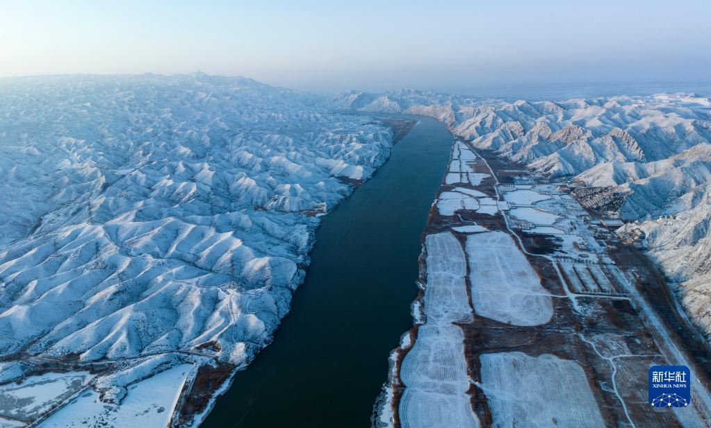 大雪過后,寧夏青銅峽黃河大峽谷銀裝素裹,黃河從峽谷間流過,美如畫卷。新華社發(祁瀛濤攝)
