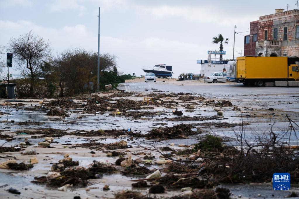 2月10日,在馬耳他納沙爾,風暴過后道路堆滿垃圾。