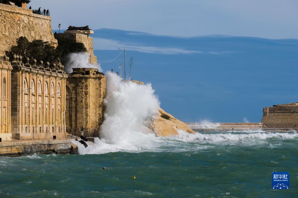 2月10日,在馬耳他瓦萊塔,大浪拍打海岸。