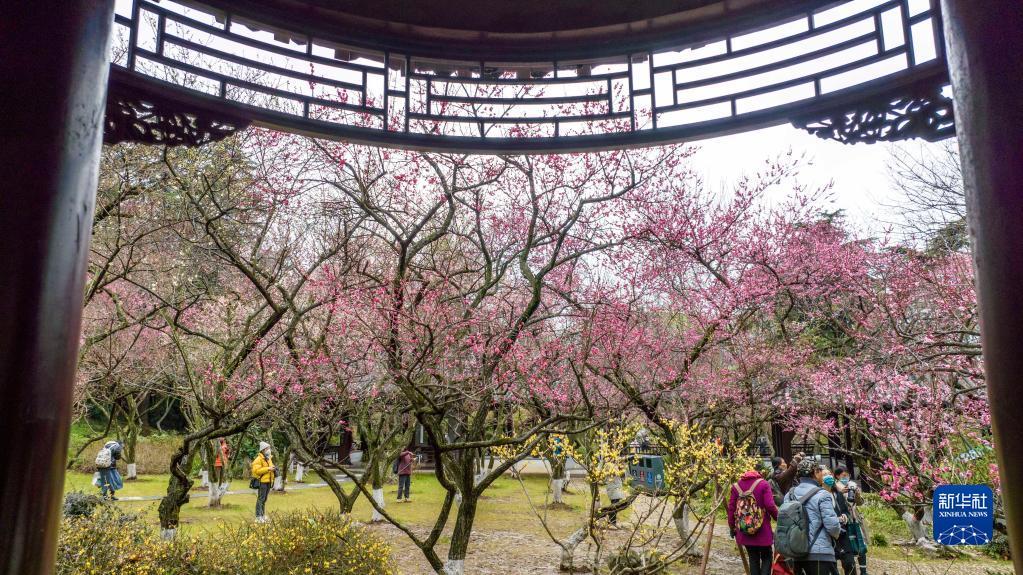 2月10日,游人在南京雨花臺風景區觀賞梅花(無人機照片)。