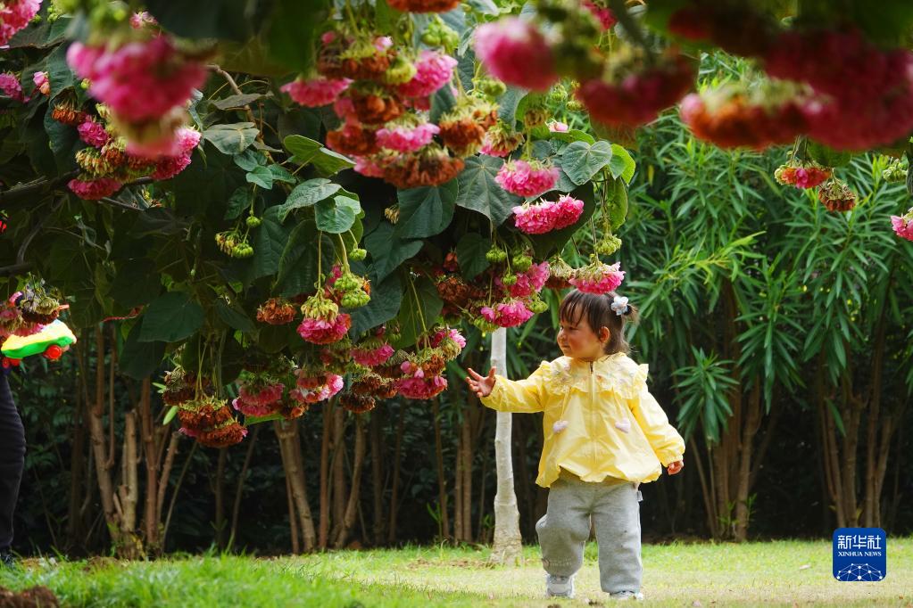 2月11日,一名小女孩在廣西南寧市南湖公園觀賞綻放的非洲芙蓉花。