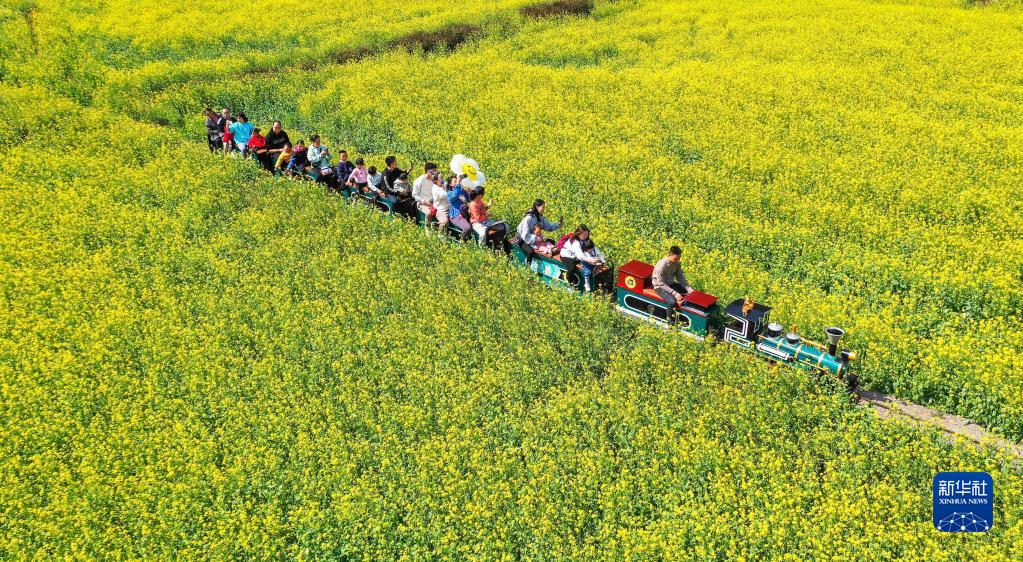2月11日,在貴州省黔西南布依族苗族自治州興義市,游客乘坐小火車觀賞油菜花(無人機照片)。