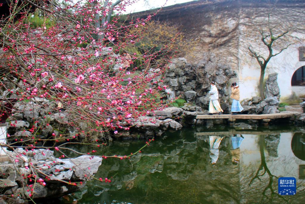 2月10日,游人在江蘇蘇州古典園林藝圃內觀景賞梅。