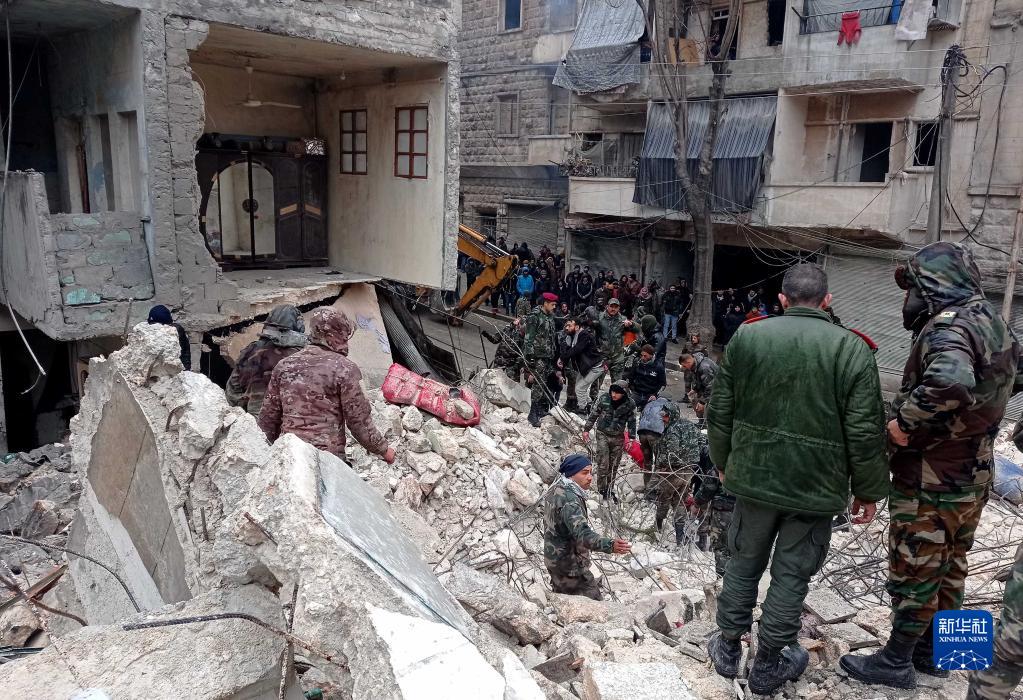 2月6日,人們在敘利亞阿勒頗省一處倒塌的建筑現場進行救援。