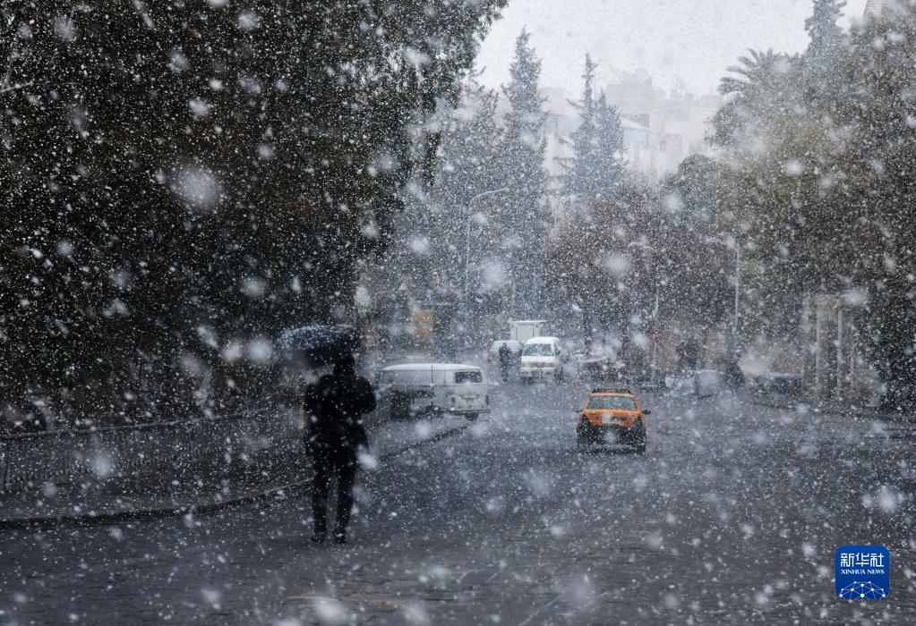 2月8日,行人走在雪中的敘利亞首都大馬士革街頭。