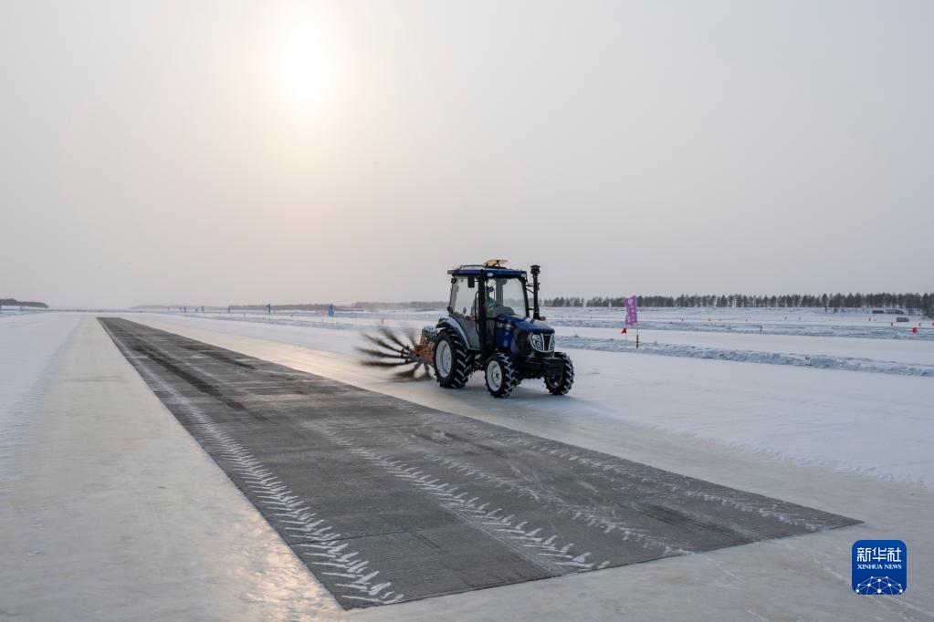 2月10日,在黑河小烏斯力測試基地,掃雪車清掃冰面上的積雪。