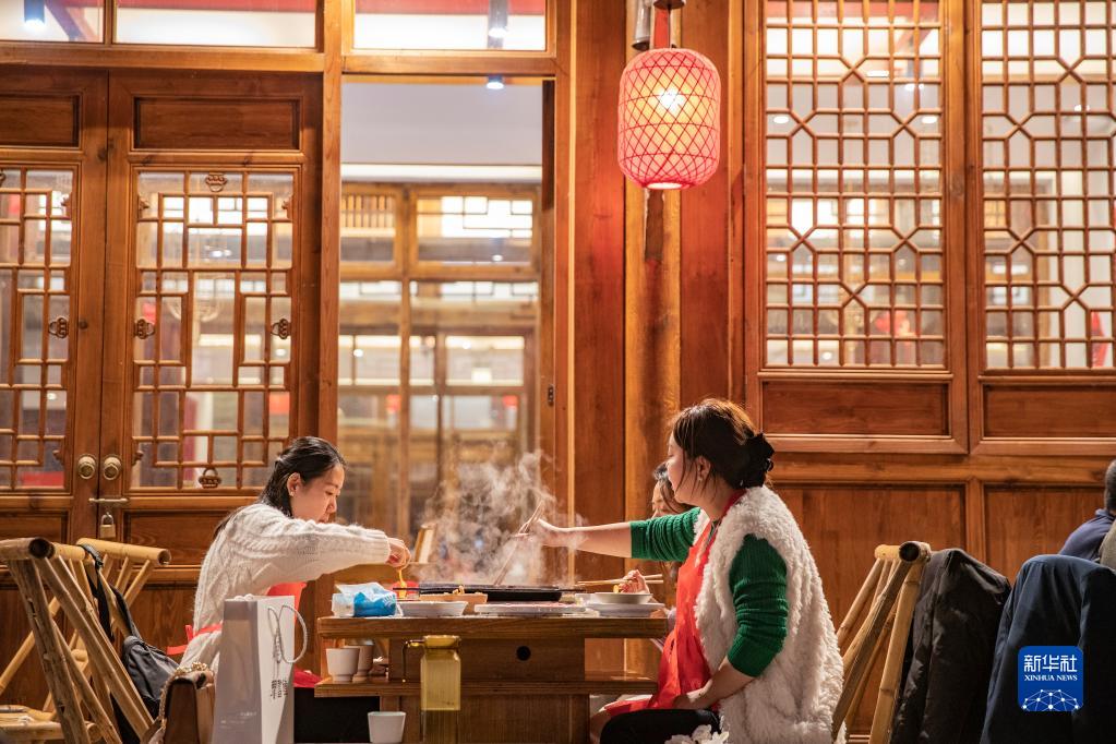 2月10日晚,游客在位于重慶市渝中區的十八梯傳統風貌區品嘗重慶火鍋。