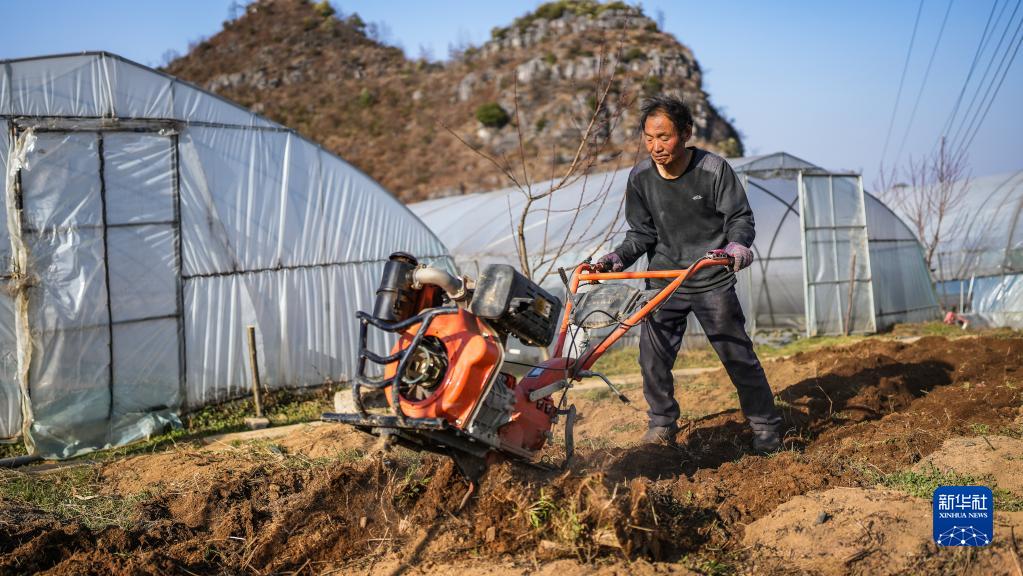 貴州六盤水市鐘山區中箐村村民駕駛小型翻耕機在田地里勞作(2月10日攝)。